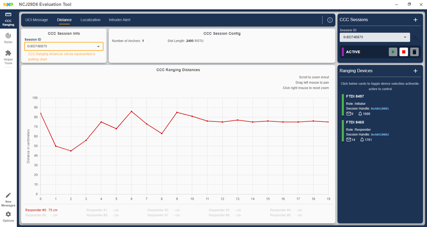 利用兩個NCJ29D6 EVB實作測距功能,一個EVB設定為Initiator,另一個EVB設定為Responder,來測量兩個EVB的距離。