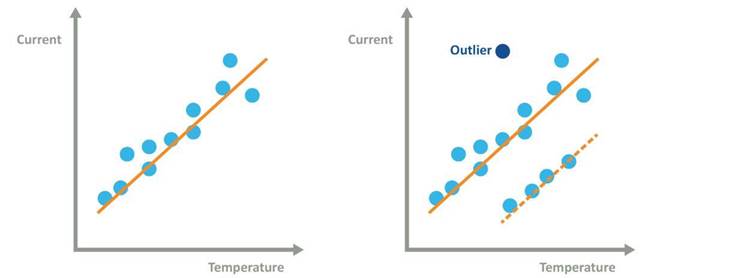 此外,由於人工智慧和機器學習能夠推斷事物——這些事物它們未必被教授過,因此它們非常擅長異常檢測和發現異常值。例如,考慮對馬達溫度和電流消耗的監控。被監控的兩個參數都有臨界值,超過臨界值就會發出警報。電流(消耗)和溫度預計會根據馬達的機械負載一起變化,例如,在圖表上繪製電流與溫度的關係圖,所有數據點都會位於或接近一條代表溫度與電流之間關係的直線上。但是,如果出現異常或異常值怎麼辦?請參見圖 2。