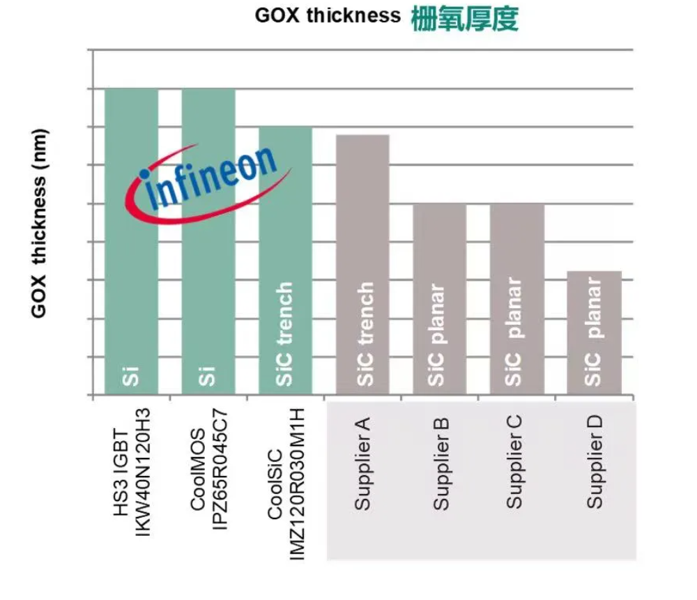 我們對比了各廠家元件的閘極氧化層厚度,發現英飛凌的SiC MOSFET閘極氧化層厚度是所有SiC元件中最厚的,與矽基IGBT元件差不多,而平面閘SiC MOSFET的閘極氧化層厚度僅有40~50nm。