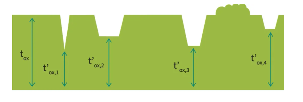 我們觀察平面型和溝槽型的元件結構,都可以發現,在閘極(G)與矽片之間,有一層薄薄的氧化層,我們稱之為閘氧化層。別看這層氧化層的厚度不足100nm,卻在SiC MOSFET的設計中,扮演著非常重要的角色,影響到元件的閾值、導通電阻、閘極電壓範圍、可靠性等多項參數。