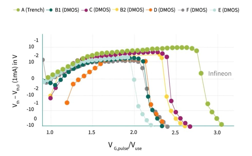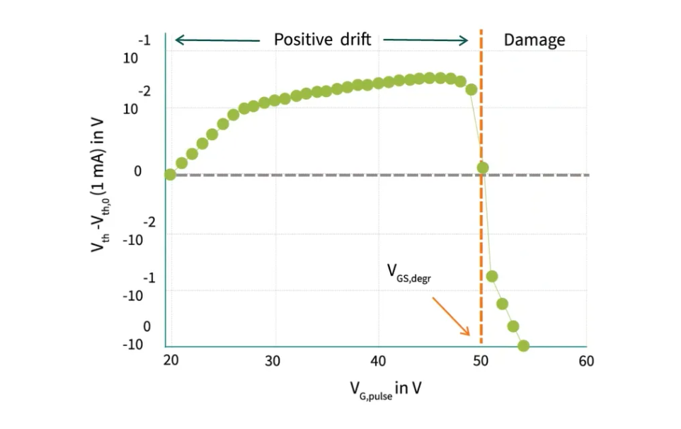 篩選時所採用的電壓與額定柵極電壓的比例對於篩選的效率至關重要,並且在很大程度上取決於柵極氧化物的整體厚度。在這張圖中,我們可以看到X軸代表短時脈衝電壓,Y軸代表閾值電壓的變化,當向碳化矽MOSFET晶片施加柵極-源極電壓時,會引入一個短時的正柵極應力,導致閾值電壓發生微小的正移。一旦柵極電壓超過臨界值,就會發現閾值電壓開始顯著下降,此時,氧化物內部達到臨界電場強度,引發內部撞擊電離。這意味著,當電荷載流子在氧化物中被強烈加速時,它可以激活新的電荷載流子,並開始產生新的缺陷。因此,如果施加的電壓高於這個臨界柵極-源極電壓,篩選過程就會進一步損壞柵極氧化物。