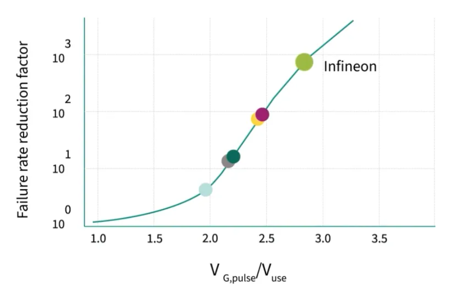 為了確保比較的公平性,應使用推薦的電壓與脈衝電壓之間的比率。從圖中可以清楚地看到,英飛凌的元件具有最高的閘極電壓。以脈衝閘極電壓和使用閘極電壓比為標準,這種改進的篩選可能性對失效率降低系數的影響更加明顯。到目前為止,英飛凌元件的故障率降低系數是最高的,比其他供應商高出近十倍,這使得我們的CoolSiC™ MOSFET具有極低的故障率。