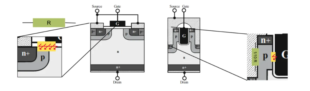 為了降低溝道電阻,平面型SiC MOSFET往往採用較高的柵極驅動電壓,或者非常薄的柵極氧化層,這使得柵極氧化層上的電場強度升高。較高的電場會加速元件老化,而這正是導致最終FIT率的主要原因。但與平面柵型相比,溝槽柵型碳化矽MOSFET的溝道電阻要小得多,也就是說,即使採用較厚的柵氧化層,仍然能夠獲得非常好的性能。