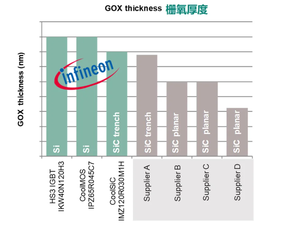 英飛凌的溝槽柵可以透過更厚的氧化層和更高的篩選電壓,來最大限度地降低柵極氧化層缺陷率,確保可靠性。
