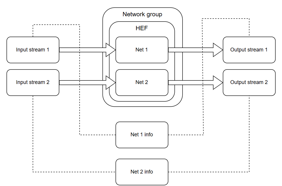 Hailo 跑模型的方式,是先建立一個 Vdevice,並使用 HEF 中的資料去設定這個 Vdevice,相當於有了一個 network group,這個 network group 中有將轉換好的模型綁定在 Vdevice 上。