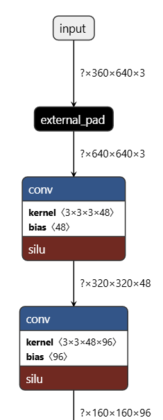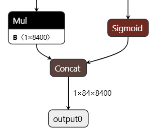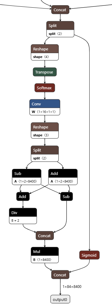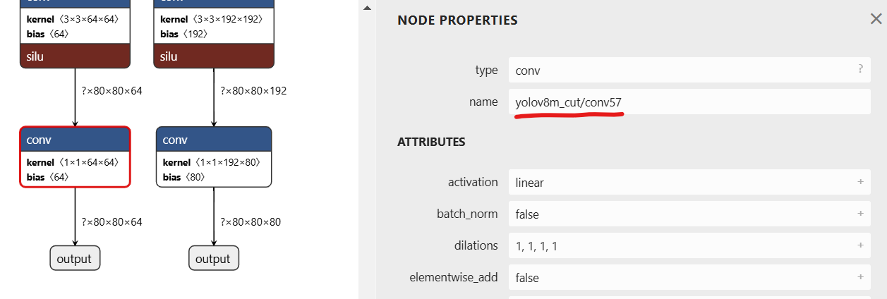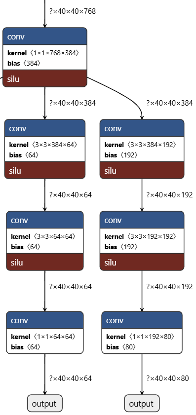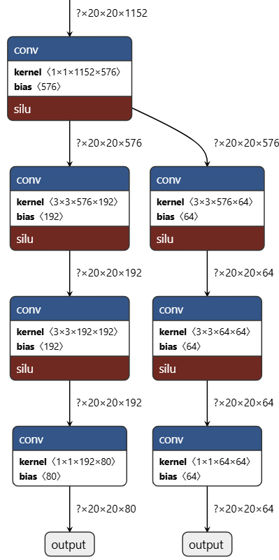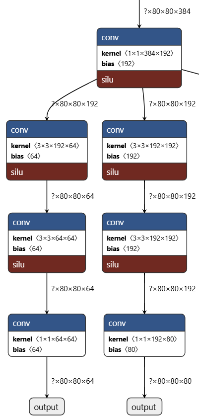 之後用到的 Hailo 內建 YOLOv8m 的後處理程式,輸入就是這六個卷積層。下圖是經過 parsing 後,模型的最前面和最尾端: