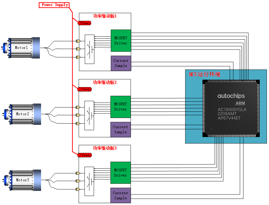 三電機控制應用方案的硬體拓撲結構如圖1所示。功率驅動板主要由MOSFET驅動和相電流採樣等模組構成。每塊功率驅動板接收MCU輸入的發波調制驅動信號,並調理電機相電流採樣信號回饋給MCU,與電機和共享MCU構成完整的控制迴路。預驅、MOSFET和MCU為獨立式分布,增強了硬體環境配置的靈活性。使用者亦可根據應用需求提高三電機控制方案的整合度,將三電機驅動的所有硬體單元整合於一塊電路板。