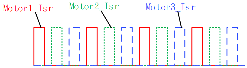 AC7840x 是一款單核 MCU,最高主頻為 120MHz。每個電機在執行 FOC 演算法時,都需要高頻率觸發 ADC 取樣,並在取樣中斷任務 Isr 中完成相應的 FOC 演算法運算。為了滿足同時運行三個電機 FOC 演算法的需求,需要設計合理的三電機應用方案 MCU 時序,對單核 MCU 進行分時複用,為三個電機的演算法運行分配時間,避免各電機演算法運行時相互衝突,同時優化各電機演算法的運行時間,確保電機演算法能在分配的時間內完成。三電機控制應用方案根據設計時序依次觸發三個電機的 ADC 取樣,並在中斷 Isr 中完成 FOC 演算法後,將 MCU 釋放給下一個電機演算法使用。MCU 運行時序圖如圖 2 所示。