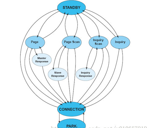 上圖是藍牙狀態轉換圖,從圖中可以看出STANDBY狀態是藍牙設備的預設狀態。在此模式下,設備處於低功耗狀態。