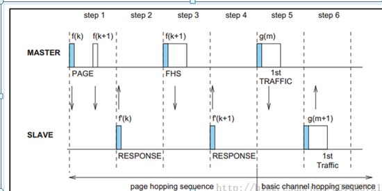 頁面掃描->從屬回應:在收到page的訊息後,page scan的設備就會發送對應的回應訊息,然後進入到slave response的狀態。
