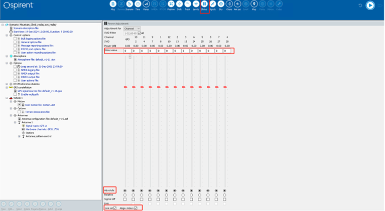 5、在完成環境建置後,啟動模擬器(GSS6700)設備,載入對應場景。打開 Sliders 面板,並勾選 Link all/Align sliders/Absolute 選項,將 Slider value 的初始值設為 0(目的是讓輸出固定為 -130dBm)。