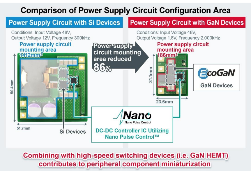 GaN 裝置已廣泛應用於高頻開關,但挑戰在於如何提高驅動這些裝置的控制器的開關速度。為此,ROHM 改進了其為電源 IC 培育的超高速脈衝控制技術 'Nano Pulse Control™',透過將控制脈衝寬度從傳統的 9ns 減少到業界最佳的 2ns 來實現高速度開關。將一個利用這項技術的 DC-DC 控制器 IC(正在開發中)與電力電路中的 GaN HEMT 結合,使 ROHM 能夠將安裝面積比傳統矽電路減少 86%(圖 5)。這項技術可以應用於廣泛的領域,包括基站、資料中心、工廠自動化和無人機,為節能和小型化做出貢獻。