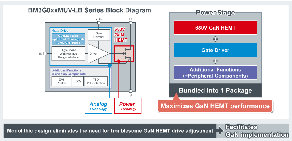 為瞭解決這些問題,ROHM 利用其在功率和類比技術方面的專業知識,開發了整合氮化鎵 HEMT(功率半導體)和驅動器(類比半導體)於系統封裝中的電源階段 IC(BM3G0xxMUV-LB)。這些產品旨在簡化氮化鎵裝置的實施,因為這些裝置驅動起來具有挑戰性。