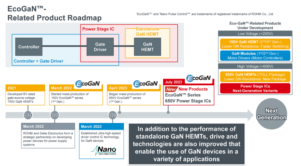 對於前面提到的功率階段IC,計劃在2024年進行配備準共振AC-DC電路、功率因數修正電路和半橋電路的模型的大規模生產。更重要的是,到2026年,ROHM將推出整合GaN HEMT、閘極驅動器和控制器的單一封裝產品,擴大EcoGaN™解決方案的範圍,以促進GaN技術的採用。