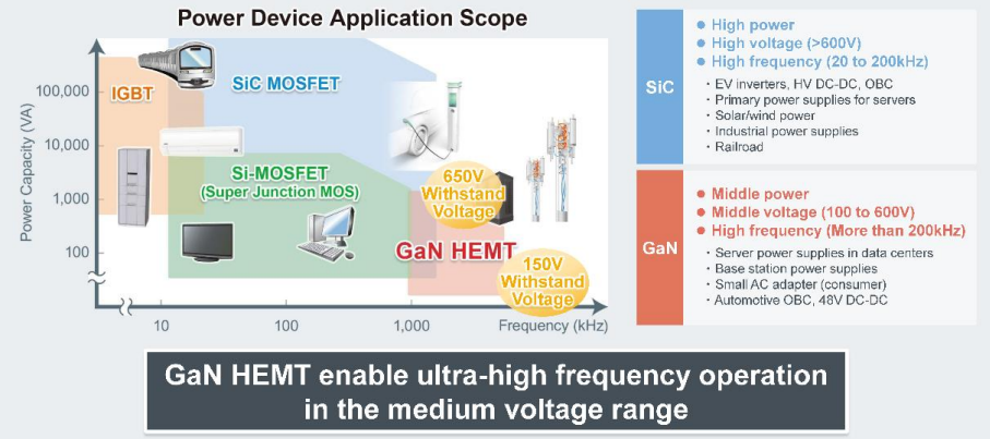 氮化鎵(GaN)和碳化矽(SiC)的帶隙比矽(Si)寬,具有多個優勢,包括擊穿電壓、熱導率和電子飽和速度,使其在需要高溫、高電流、高電壓和高頻操作的半導體應用中理想化。雖然SiC在高電壓、高電流操作方面表現優越,但GaN在100V到600V的中等電壓範圍內提供更優越的擊穿場強和電子遷移率,實現了低ON電阻和快速(高頻)開關(圖1)