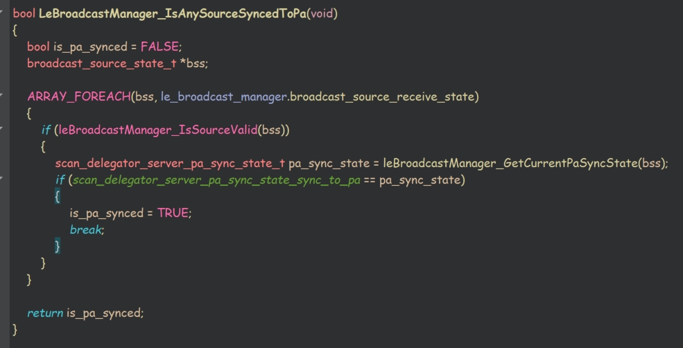 在按鍵處理邏輯中,需先判斷當前是否有接收廣播。可透過LeBroadcastManager_IsAnySourceSyncedToPa函數進行判斷。