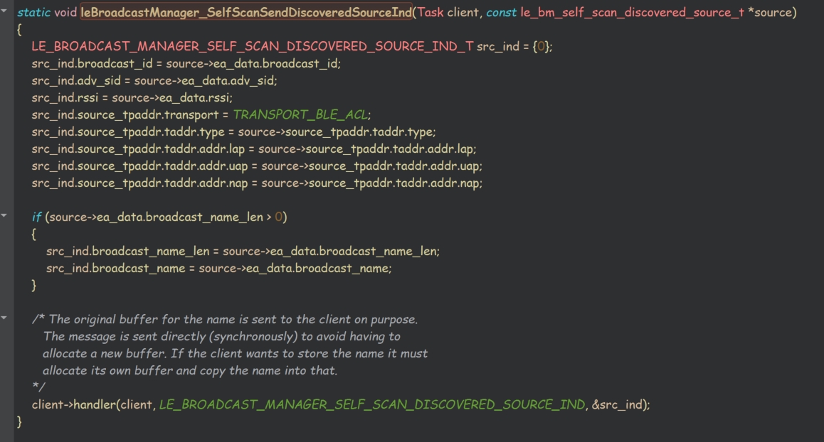 3. 若採用此方法,掃描結束後需一次性將所有廣播通過 leAudioTest_BassAddSource 添加到管理器列表。重新掃描時,需通過 leAudioTest_BassRemoveSource 移除全部廣播源。