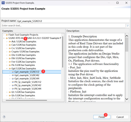 打開 S32DS,點擊「File」→「New」→「S32DS Project from Example」,在彈出的對話框中選擇「S32K3 RTD AUTOSAR 4.4 2.0.1 D2207 Example Projects」,然後在下方找到「Gpt S32K3xx Examples」,選擇「Gpt_Example_S32K312」,點擊「Finish」完成專案匯入。