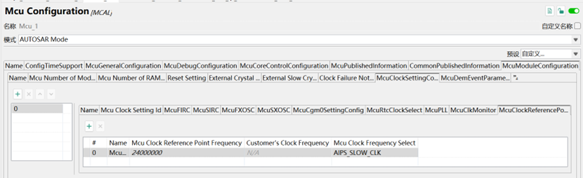 在外設中選擇Mcu模組,在「McuModuleConfiguration」->「McuClocksettingConfig」->「McuClockReferencePoint」可以看到我們在Gpt模組中引用的時鐘來源。