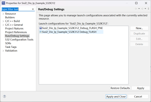 但是我們還缺少將匯入的範例程式燒錄進晶片的途徑,不僅需要我們準備燒錄工具,也需要安裝S32DS對接電腦燒錄USB的底層驅動。右鍵打開任意一個匯入範例程式的「Properties」,再點選右邊的「Run/Debug Setting」,可以看到範例程式提供了兩種基本的燒錄方式,以「PNE」結尾的是使用Multilink工具,另一個則是Jlink的燒錄配置。