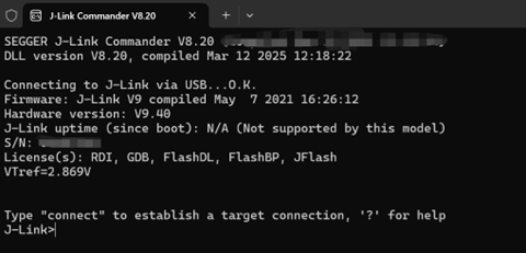 安裝完成後,我們可以打開「J-Link Commander V8.20」,如果此時板子已經透過jlink硬體連接到電腦,你會看到: