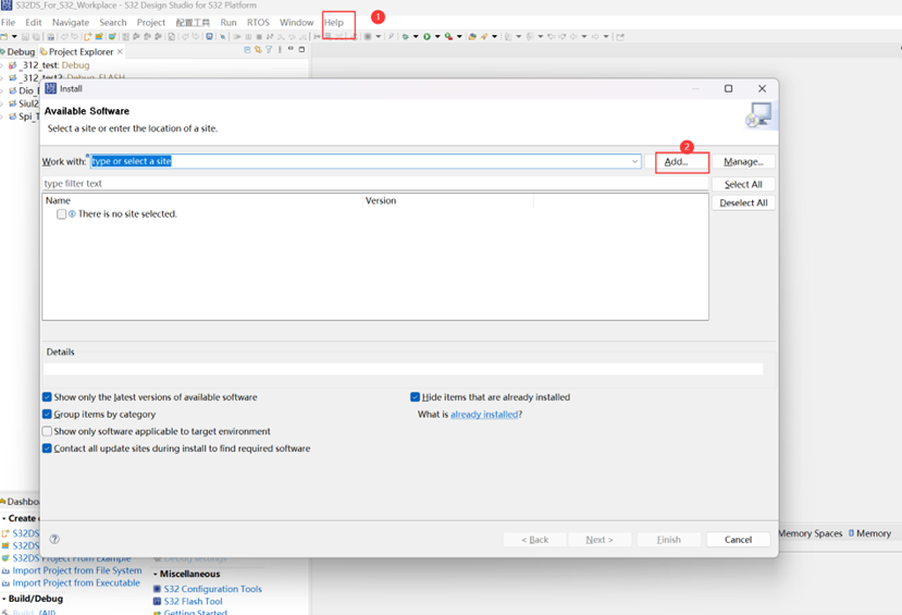 接下來我們透過S32DS進行安裝。選擇「說明」中的「安裝新軟體..」,並點擊彈出對話框中的「新增..」。