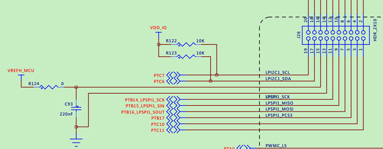 S32K312 的 SPI 分為 Flexio_SPI 和 LPSPI,前者通常用於 IO 模擬,本次使用 LPSPI 進行通信。查看原理圖可以看到 J26 有 LPSPI1 的引腳。