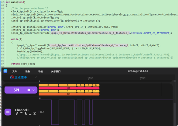 我們操作SpiMaster的主要介面在Lpspi_Ip.h、Lpspi_Ip.c裡,具體有Lpspi_Init/Lpspi_SyncTransmit/Lpspi_AsyncTransmit/Lpspi_Ip_UpdateTransferMode函數。在主函數中添加以下程式碼: