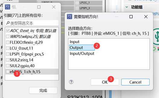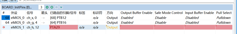 然後剩下PTB12、PTB16,分別是原封裝的兩個eMIOS引腳,一個作為基準MasterBus,可以理解為reference source;另一個則是原開發板的LED燈引腳。我們可以刪除PTB16,改為Knight評估板的藍燈PTB8,選擇最後一個複用功能 eMios_1:ch_h,15。