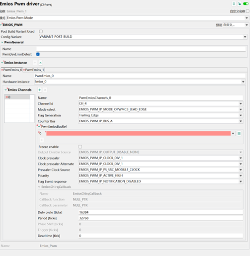 此時尚未解決全部錯誤,轉到外設頁面,可以看到Emios相關有兩個模組:Emios_Mcl_Ip_1和Emios_Pwm_1。前一個模組即為PTB12作為MaserBus的配置模組,後一個是我們主要關注的,可以進行配置修改的PWM輸出的模組。