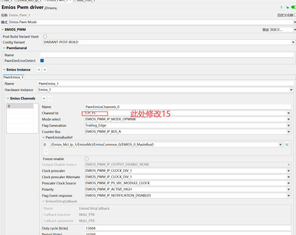 打開第二個模組Emios_Pwm_1。在Emios Instance部分,我們也需要刪除第一個配置Emios_0,因為原專案設定了兩個輸出,我們只需要一個輸出PTB8(Emios_1,ch15)。
