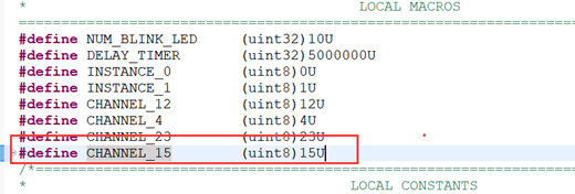 回到專案程式碼頁面,main.c檔案。這個範例中,我們將原本的CH4、CH12改為了CH15,且CH12和CH15都屬於同一個模組Emios_1,所以我們可以註解掉所有包含CH4的程式碼,並將CH12修改為CH15。