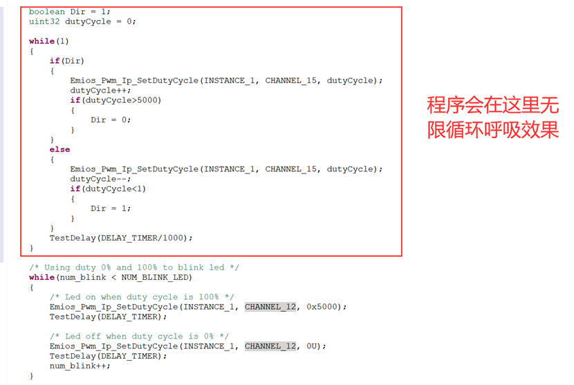 此時,我們專案的 while 迴圈裡還不是我們想要的呼吸燈函數,但可以看出我們可以透過更改 PWM 的 dutyCycle 來改變 LED 燈的亮度。在這裡,我們可以用自己的呼吸燈函數替換掉原有的 while 迴圈。