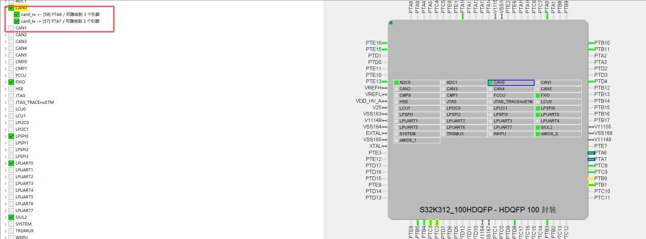 引腳則是選用PTA6和PTA7作為CAN0的輸出: