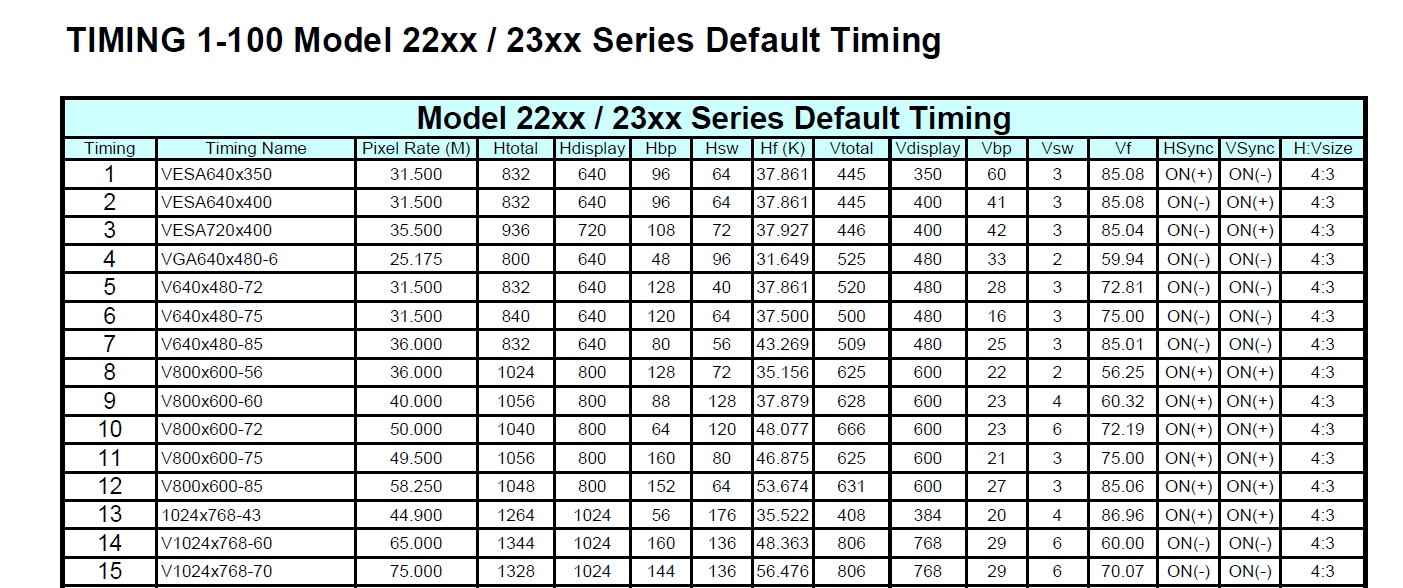 顯示器輸入介面可能會接收到來自不同來源的影像訊號,因此可能會遇到各種規格的解析度Timing。Chroma 2238提供了各影像協會所制定的影像解析度Timing,供使用者直接選擇測試。同時,如果需要,還可以手動修改細部參數,甚至創建自訂的影像Timing進行輸入測試。Chroma 2238內建的Timing可以參考使用手冊中的列表(如下圖),我們可以看到像VESA協會等制定的Timing規格都已記錄其中,可以直接調用。列表中還清楚標明了從Pixel clock、V/H Total、Width、porch等參數到V/H sync極性等資訊。