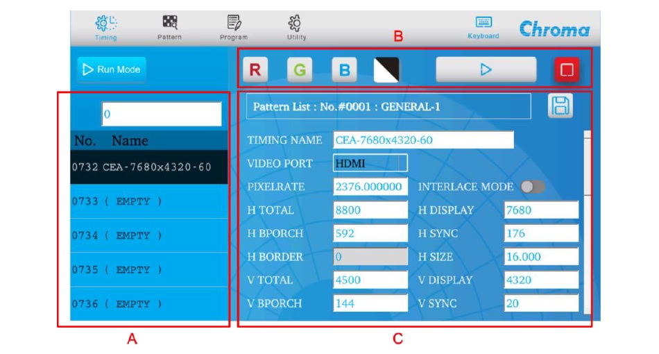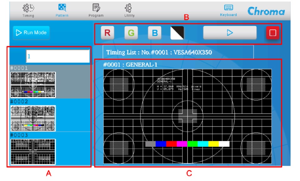 操作介面上可以直接使用觸控介面或按鍵方式按下「Pattern」選項即可啟動如下圖介面,在紅框A處同樣可以輸入上列表中的Pattern編號即可調出對應Pattern,紅框B部分可以啟動/停止輸出,同時按下R、G、B還可以針對影像三原色中的個別顏色獨立控制是否輸出,紅框C為選用Pattern的預覽圖可以用於比對實際輸出狀況,也可針對預覽Pattern進行放大/縮小的控制功能以進行局部Pattern的詳細比對。