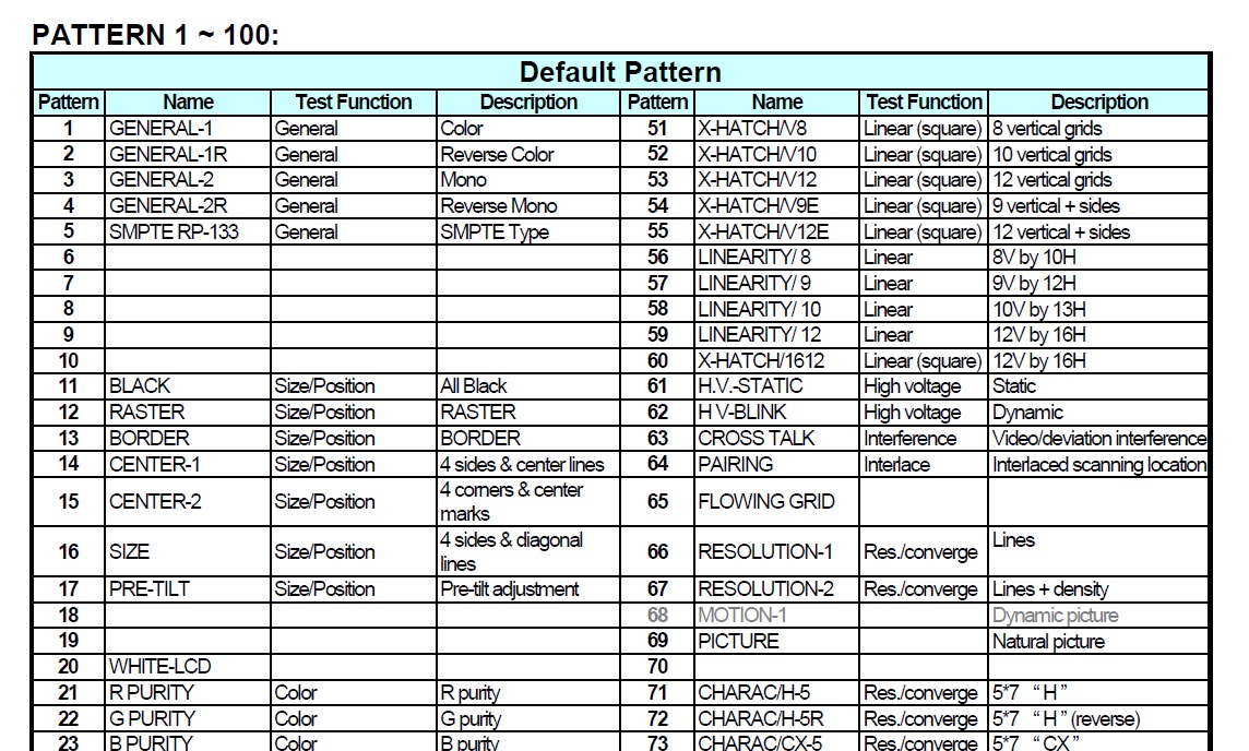 如同 Timing 列表,Chroma 2238 內建的 Pattern 也可以參考使用手冊中的列表(如下圖)。