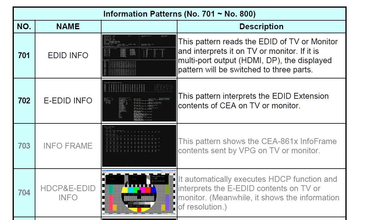 因為Pattern的選擇具有測試需求的視覺效果或顯示資訊等目的性,因此手冊還提供了如下圖所示的列表預覽圖與說明。本文測試範例將針對Pattern 701、704等,介紹如何明確輸入端HDCP、EDID等是否完成正常握手的測試方法。