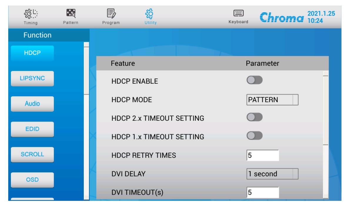 除了上述的「Timing」和「Pattern」設定之外,根據本文的測試,我們在「Function」上也可以進行一些設定,以決定在播放Pattern時是否自動啟動HDCP握手驗證,將顯示輸出的必要條件分開。這樣可以針對沒有HDCP的產品或HDCP功能有問題的情況進行其他部分的實驗驗證。同樣地,通過Chroma 2238操作介面上的觸控介面或按鍵方式,按下「Utility」選項,選擇HDCP Function中的HDCP Mode並將其設定為「PATTERN」,這樣就可以針對在Pattern切換時是否先進行HDCP握手驗證進行設定。