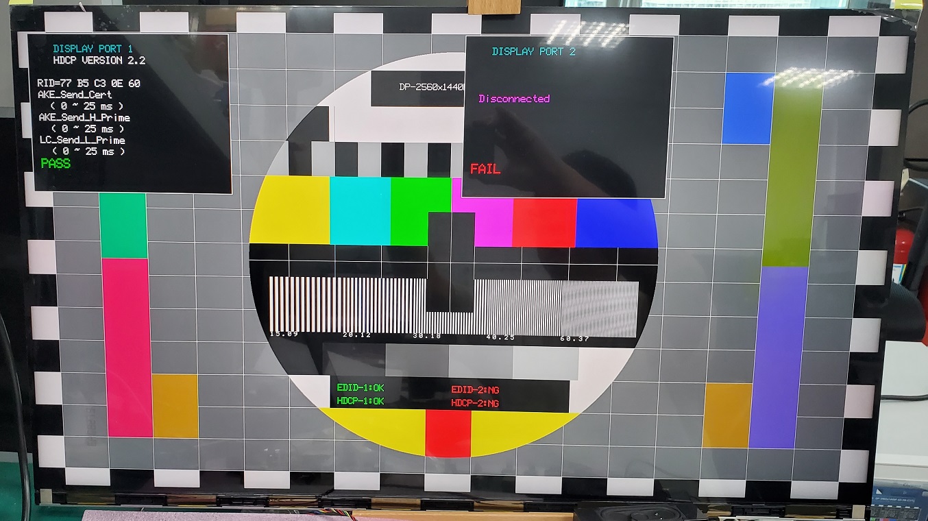 Chroma 2238針對產品HDMI與DisplayPort的HDCP提供了握手確認HDCP密鑰是否啟用的功能,同時還包含解析HDCP版本的功能。進行此測試只需在固定可顯示的Timing輸出下選擇Pattern 704即可獲得測試結果。測試結果如下圖所示,包含了DisplayPort和HDMI的測試畫面。上方黑框處左側實際連接產品並顯示測試通過(PASS),同時顯示HDCP版本號;右側另一個端口(DisplayPort或HDMI)未連接時,可以看到測試結果顯示為失敗(FAIL)。透過下方黑框處也可以快速觀察HDCP和EDID測試是否正常(OK)。