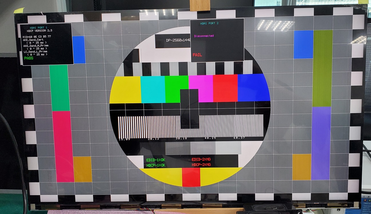 在測試工具上,我們使用 Chroma 2238 視訊信號圖形發生器提供各種顯示器介面的測試影像信號源。Chroma 2238 具備各種視訊標準的模擬/數位信號輸出功能,機體本身採用模組化設計,各模組中均內建獨立的高速繪圖核心,可提供各種解析度的標準檢測信號與影像,滿足當前及未來各種多媒體顯示器產業研發與測試應用需求。模組化信號介面設計使得 2238 最多可同時搭載四塊信號模組,使用者可根據檢測應用選擇最合適的組合方案,同時有利於未來擴展或規格更新時無需更換整機,僅需針對單一模組更換即可。透過此設計實現了產品節省生產成本並具備未來擴展的永續性目標。信號模組中均內建高速的獨立繪圖核心,大幅提升了繪圖和數據傳輸速度,8K 超高清解析度影像切換時間最快僅需 200 毫秒。此外,還支援模組同步輸出功能(Multi-Out),最多可在四個模組上同時輸出不同時序(Timing)與測試圖形(Pattern)。