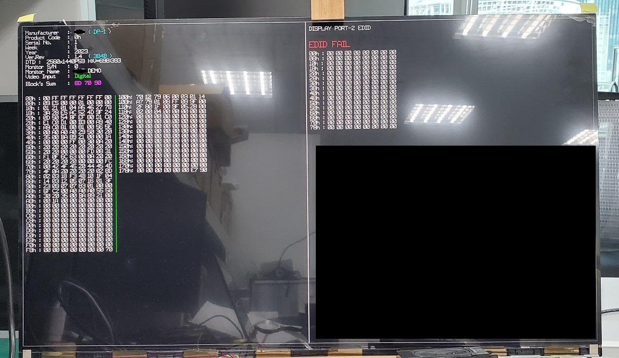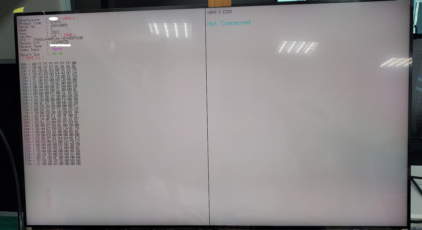 Chroma 2238針對EDID也提供握手讀取甚至基本解析資訊的功能,要進行EDID讀取測試,只需在固定可顯示的Timing設定下選擇適當的Pattern即可完成。首先切換到Pattern 701輸出後,可以看到DisplayPort與HDMI測試結果如下圖所示,左側是正確連接產品並成功讀取EDID的測試結果,可以看到螢幕上方會解析顯示基本的製造商等資訊,下方則顯示完整讀取到的EDID十六進位代碼;右側則是未連接或讀取失敗的顯示結果。