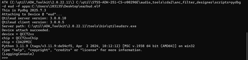 ATK (C:\qtil\ADK_Toolkit\2.0.22.11\) C:\qtil\S7S5-ADK-251-CS-r00296E\audio_tools\cda2\anc_filter_designer\scripts>pydbg -d eud -f apps:C:\Users\103135\Desktop\earbud.elf