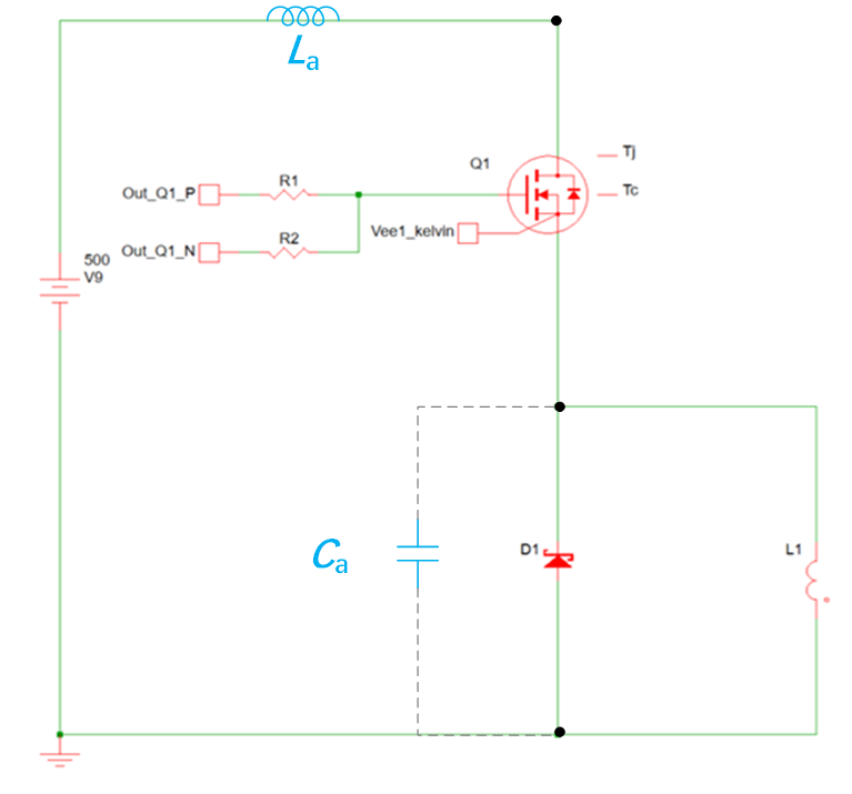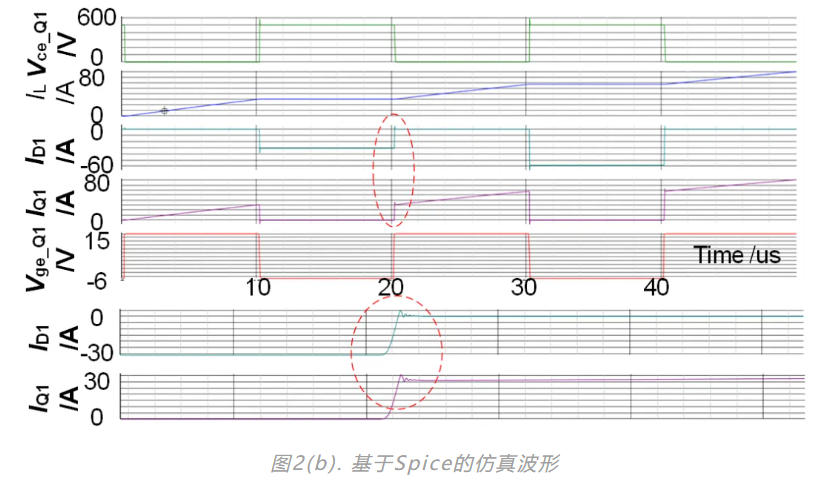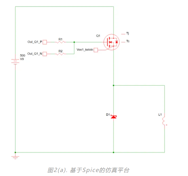 如前述分析,SiC蕭特基二極體應該不存在反向恢復現象,但是為什麼採用SiC蕭特基二極體換流時,開關管依然存在開通電流尖峰?為了方便分析這個問題,基於Spice模型搭建模擬平台進行分析,如圖2所示。