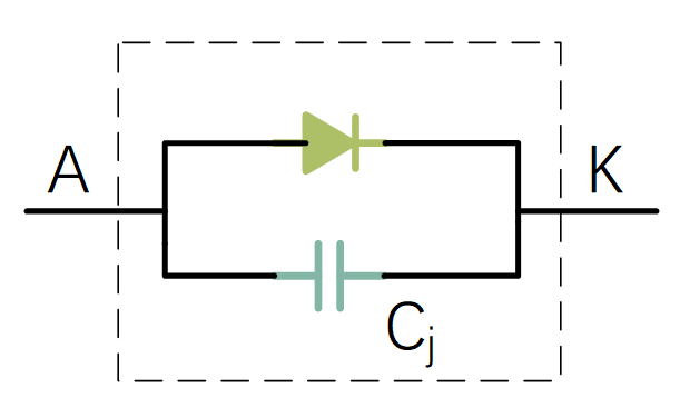 從圖2(b)的模擬中可以觀察到與實測類似的波形,即在SiC-MOS與SiC蕭特基二極體換流時,存在開關管導通時的電流尖峰。進一步分析,蕭特基二極體可以等效為如圖3所示的二極體與寄生電容並聯的結構。