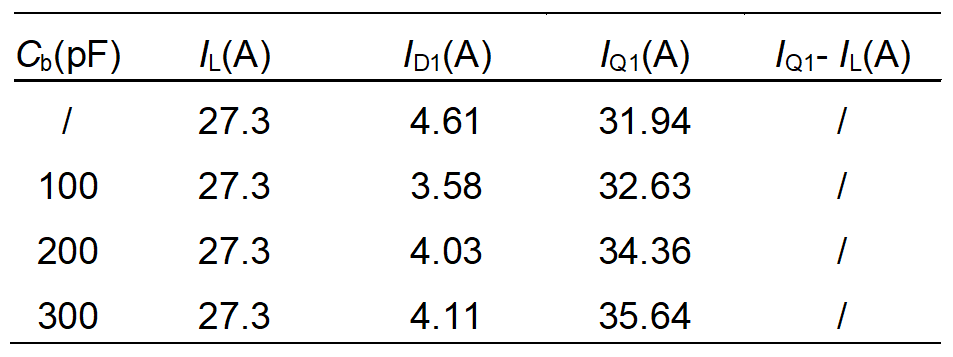 根據圖4(b)以及數據彙總表2,可以看到越大的等效寄生電容C一個,會導致開關元件的電流尖峰越大。因此,在選擇SiC元件時,寄生電容是一個重要的參數。