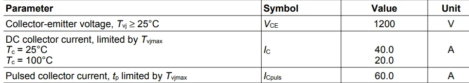 2200W電磁爐一般採用20A IGBT,例如IHW20N120R5逆導型IGBT單管。從表4中可以看出:其集電極直流電流在管殼溫度100度時為20A,集電極脈衝電流為60A,這一單管的集電極脈衝電流和RBSOA為標稱電流的3倍。