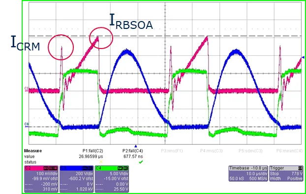 由於準諧振電路,IGBT開通時電壓很低,但因為諧振電容,脈衝電流非常大,接近50A,此時有相當高的開通和導通損耗;關斷時是零電壓,雖然關斷電流高達60A,已經達到RBSOA的極限,但關斷損耗並不大。