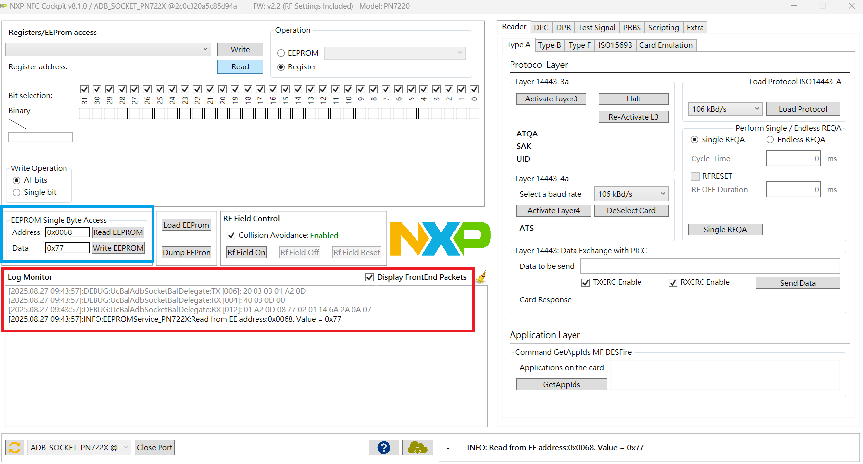 勾選”Display FrontEnd Packets”,Log Monitor會顯示執行讀取/改寫時DH與NFCC溝通時傳輸的指令。