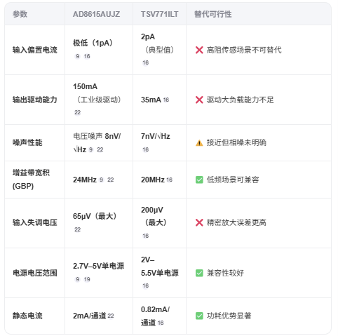 根據TSV771ILT與AD8615AUJZ的關鍵參數對比及應用場景分析,大部分場景可以替換,但兩者無法完全相互替代,核心差異如下: